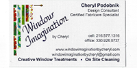 Cheryl has developed lifelong clients in her 41 years of experience in her own creative style. Window Imagination by Cheryl creates interior window treatments for both residential and commercial locations coordinating color schemes, style, functionality, and personal taste. Window treatments available include blinds, shades, custom-designed draperies, top treatments, and accessories from an extensive fabric selection.